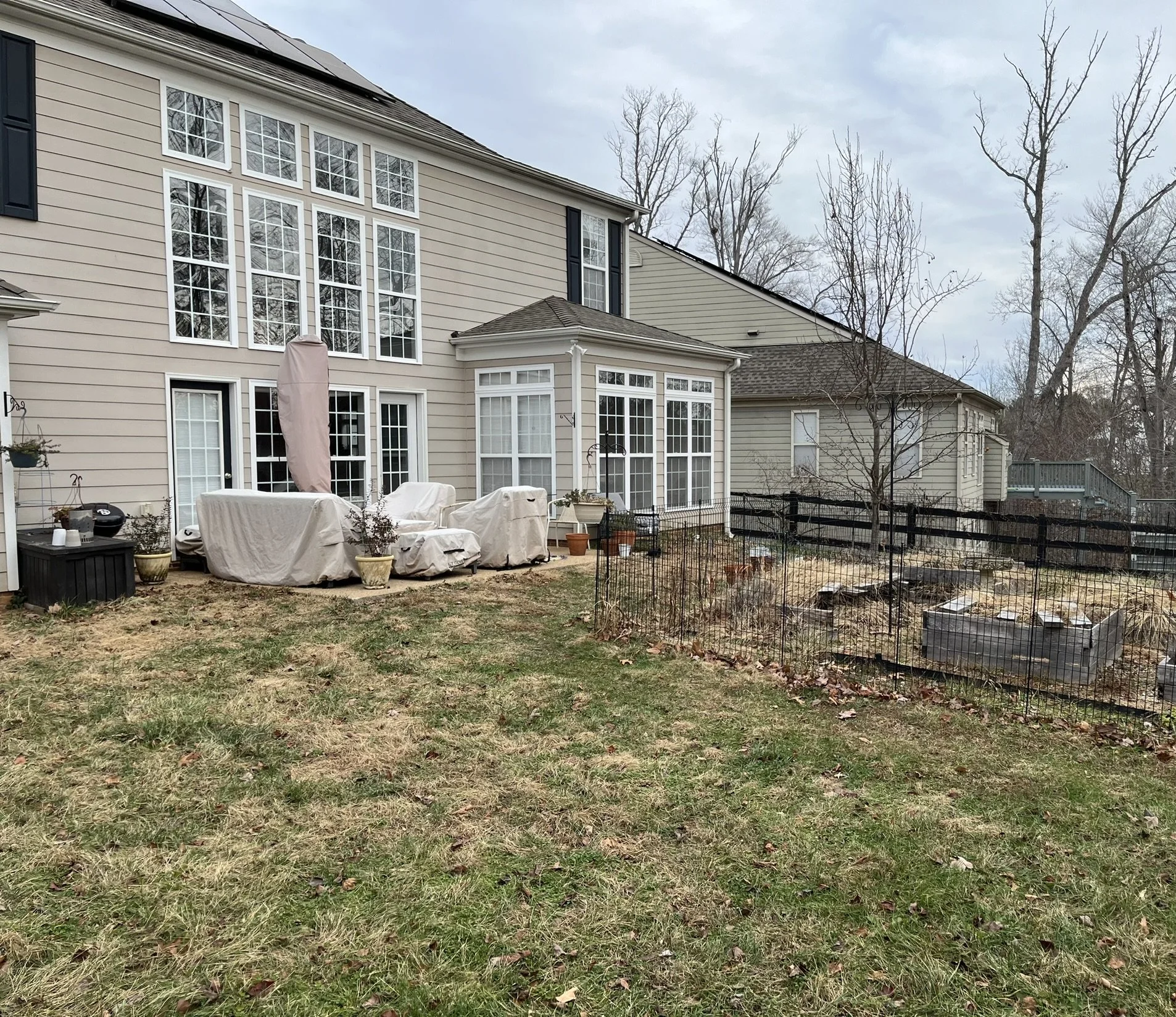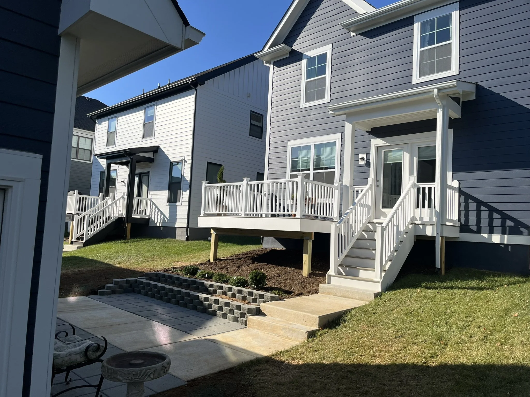 Backyard conversion - after picture - Trex deck extension, tiered planting beds, paver patio extensions alongside existing sidewalk